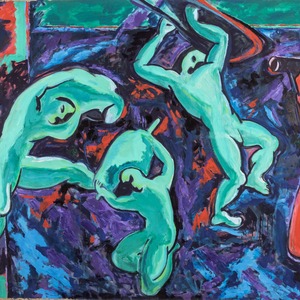 The works of Moldakul Narymbetov, an artist-shaman, leader of the “Kyzyl Traktor” group, who passed away early, have not been shown in Almaty for many years. On a monumental in size canvas, Narymbetov painted an homage to the famous painting by Henri Matisse "Dance". The author included in the composition the figures of fellow artists from the "Kyzyl Tractor" Smail Bayaliyev, Arystanbek Shalbaev, Vitaly Simakov, Said Atabekov and himself dancing and playing music, referring to their own performances in the 1990s, which were often accompanied by shamanic dances and music.