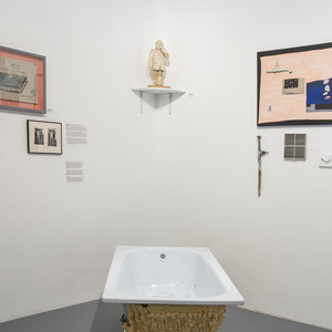 Work in Progress offers an ironic yet critical reflection on life and art beyond genre and stylistic boundaries. A key element of the exhibition is the integration of real objects from the artists’ studios into the gallery space — a sofa, carpet, table, shelf, bathtub, and other items – are incorporated directly into the exhibition space. These objects are not merely scenographic elements, but artifacts charged with personal histories and narratives that resonate with the artworks themselves.