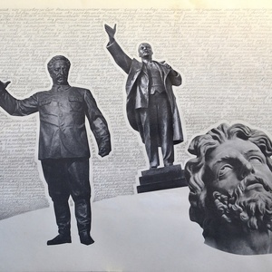 Узбекский художник Вячеслав Ахунов (р. 1948) работает с коллажем практически всю свою творческую карьеру. На протяжении десятков лет он методично собирал обрезки журналов, плакатов и других печатных материалов советского периода и представлял в совершенно новых, неожиданных контекстах. Так, в серии «Мантры СССР» статуи Ленина наравне с различными античными скульптурами появляются из песков, словно только что обнаруженные археологами. Если в своих графических работах Ахунов критикует предшествующую идеологию, то в своей инсталляции Wandering он обращается к современному обществу. Инсталляция состоит из бумажных гигиенических пакетиков, которые выдают в самолетах и где хранятся всевозможные принадлежности современного мира – талоны, билеты, брошюры, этикетки и т. д., накопленные автором во время поездок в Китай и США.
